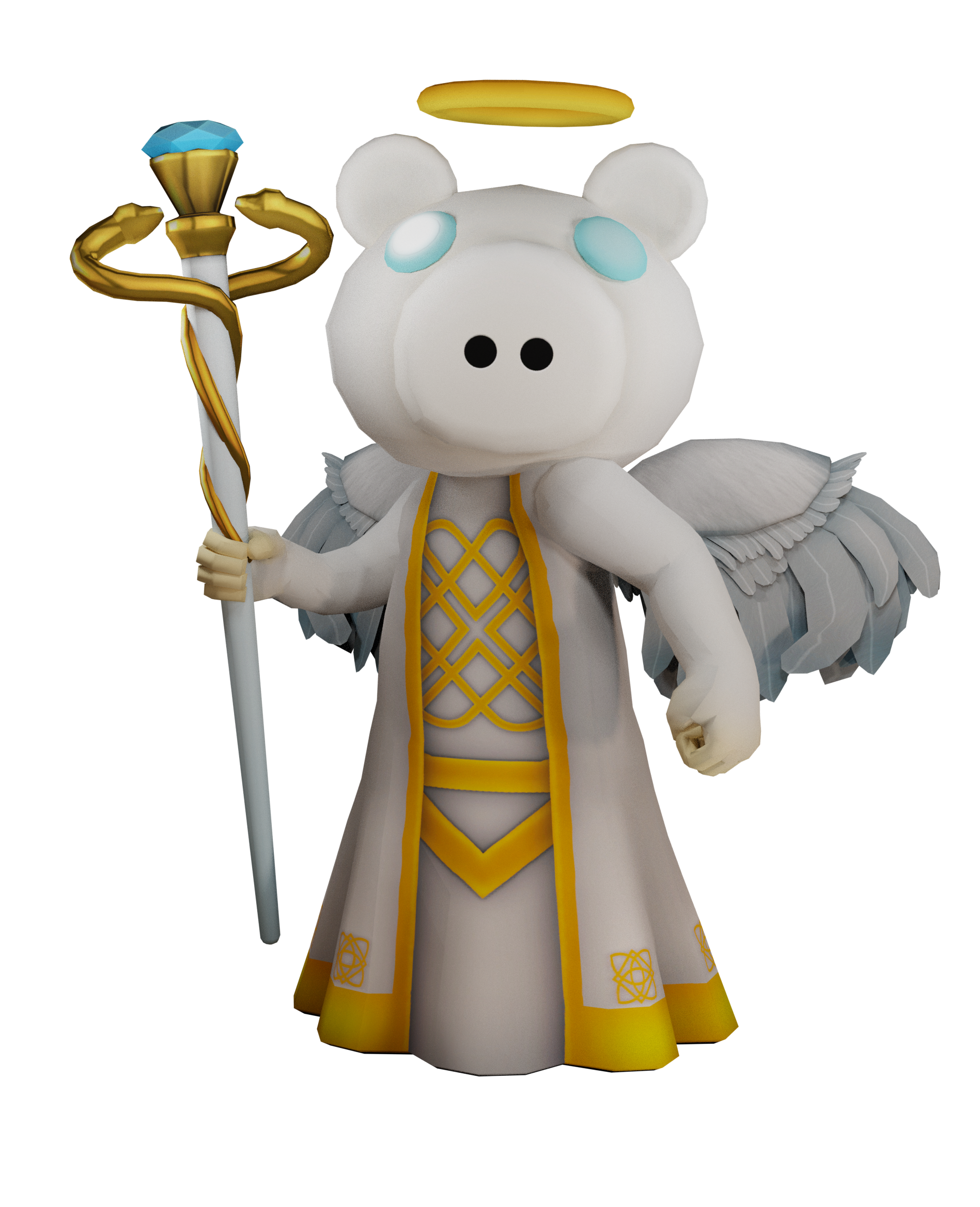 In PIGGY: Hunt, Angel still retains some similarities from their original design, though with notable changes. Their dress is now white with yellow patterns. The pale yellow cheeks are absent, their nostrils are darker, their sclera is paler, and their wings droop downward rather than standing upright. Angel's staff has also been redesigned to have two yellow swirls that look like snakes, pointing towards a cup-looking attachment to the top of the staff that holds a blue gem.